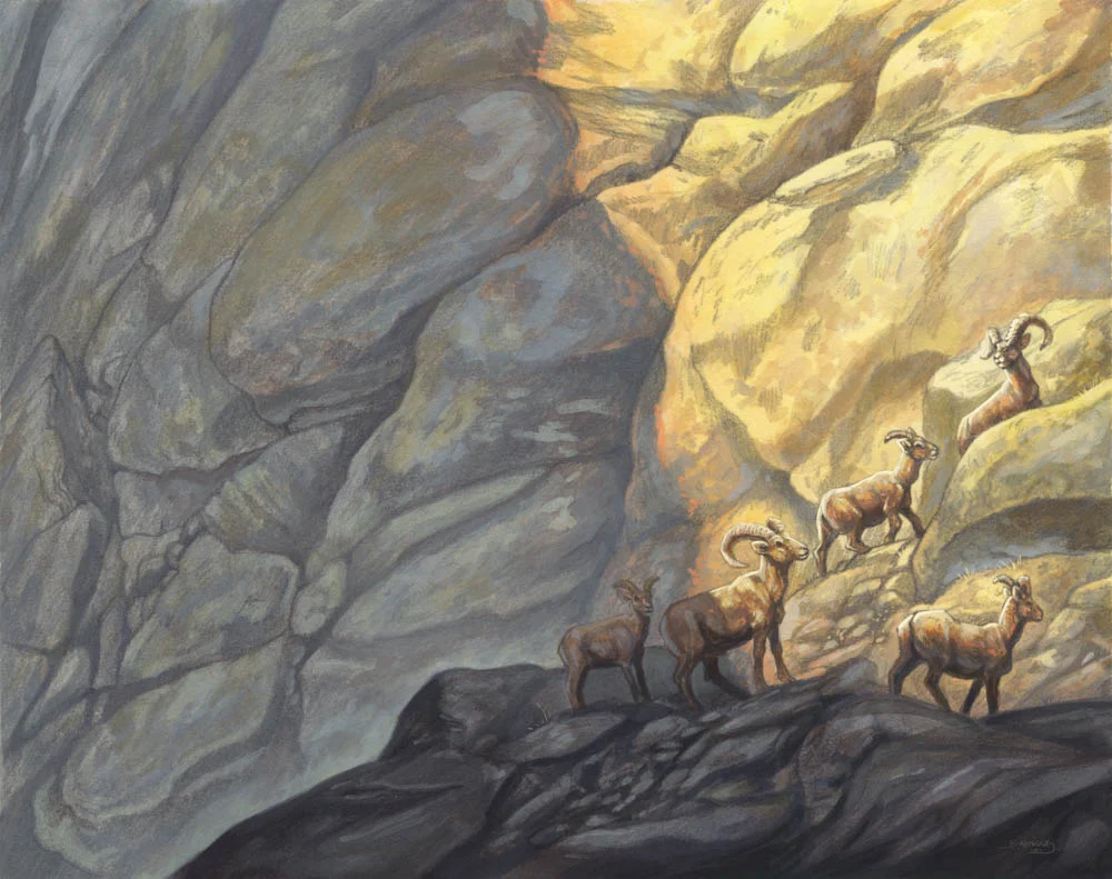 “I chose the Sierra Nevada Big Horn because they are the fearless mountain climbers. Sheep and goats that inhabit these unreachable worlds are incredible athletes; navigating sheer cliff faces and trotting on unstable rock. I have a special place in my heart for the wilderness of California and the Sierra Nevada Big Horn embodies the spirit of that completely. The piece I produced features a lot of environment and I wanted the mountain itself to have a big presence in the image. I wanted there to be a silence about it as the sheep moved through the space; calm and in control.”